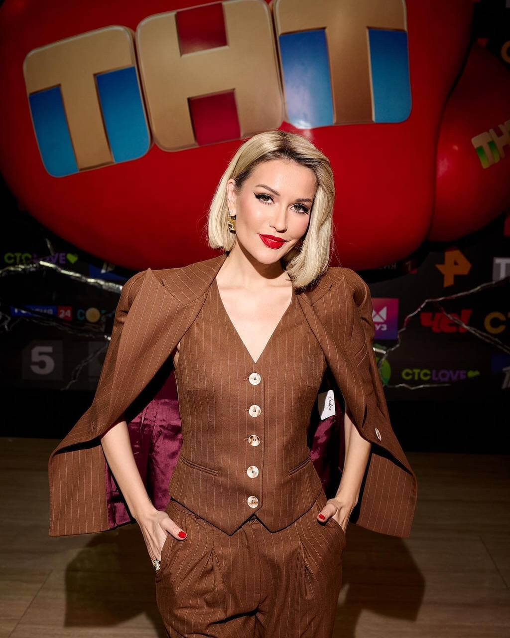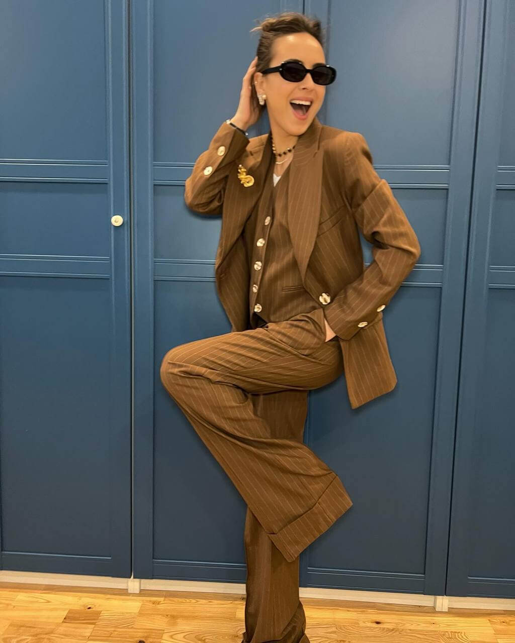 На Таше образ SAWUBONA — костюм тройка Капучино Budoar Bianca (пиджак + жилет + брюки прямого кроя)